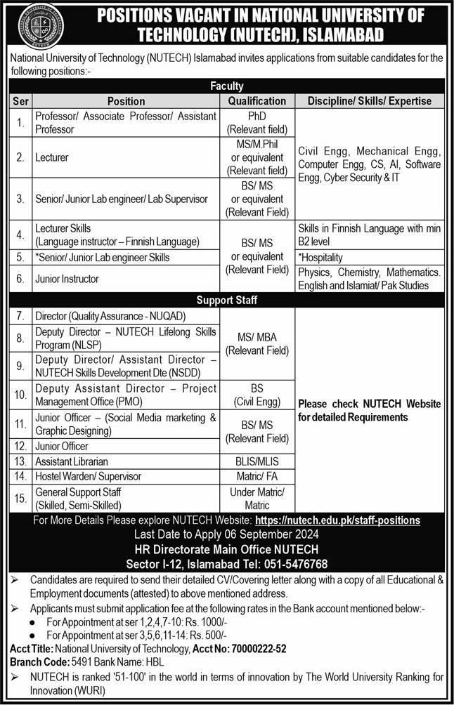 Vacancies in National University of Technology NUTECH Advertisement August 2024