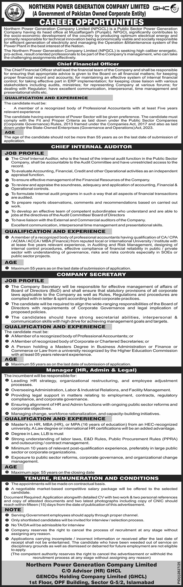 Northern Power Generation Company is looking for candidates for following posts as per job advertisement published in daily Nawaiwaqt Newspaper of October 5, 2025 for location G-5 Islamabad, islamabad Islamabad Pakistan: