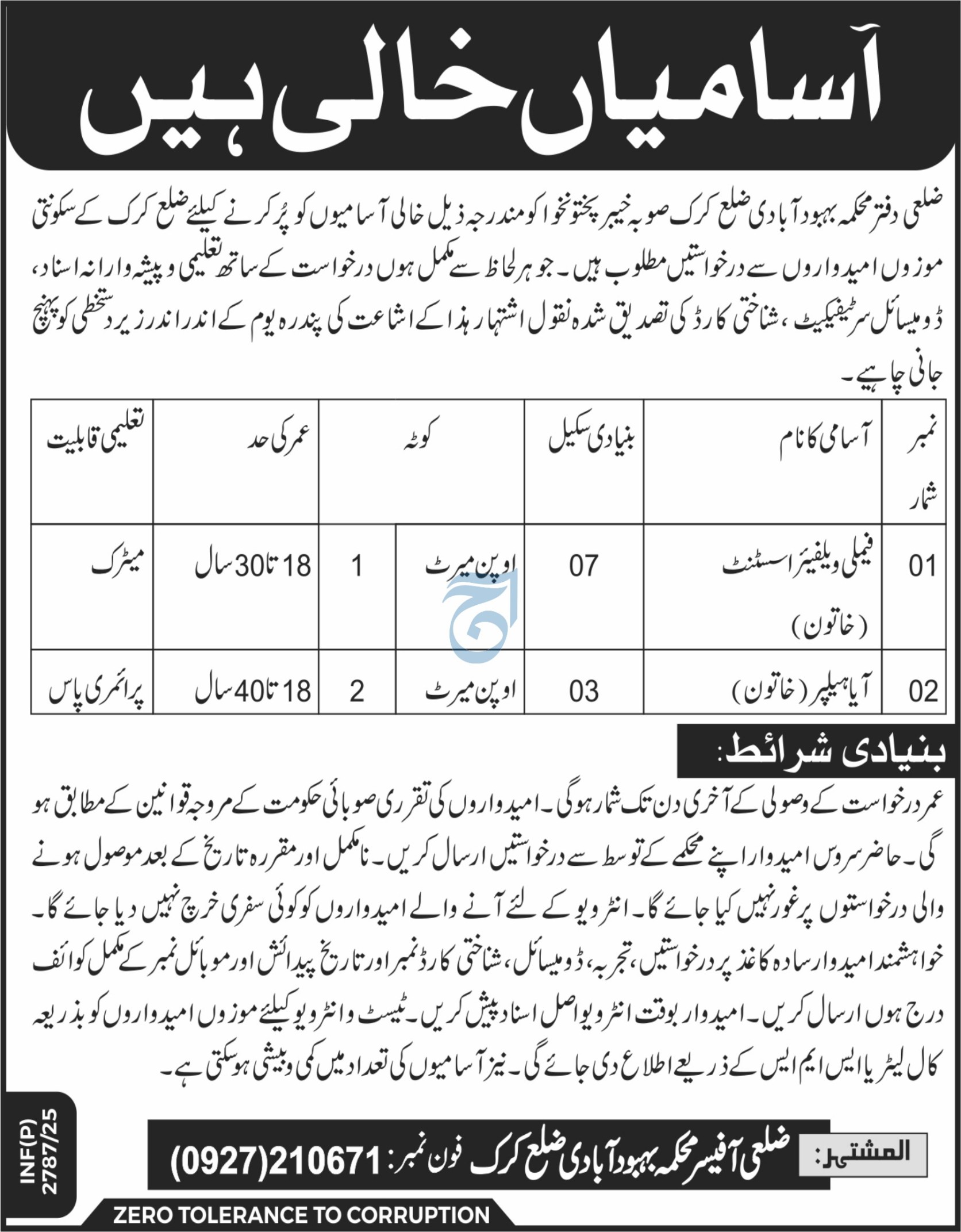 Vacant posts including female family welfare assistant, helper and aya are announced in Population Welfare Department Karak, karak Khyber Pakhtunkhwa KPK Pakistan as per 29 June 2025 advertisement in daily Aaj Newspaper. Candidates with Primary and Matric etc. educational background will be preferred.