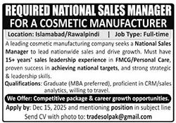 Private Company Islamabad, islamabad and rawalpindi Islamabad Pakistan invites applications from eligible candidates for the post of national sales manager as per advertisement of November 16, 2025 published in daily The News Newspaper. Candidates with MBA etc. educational background will be preferred.