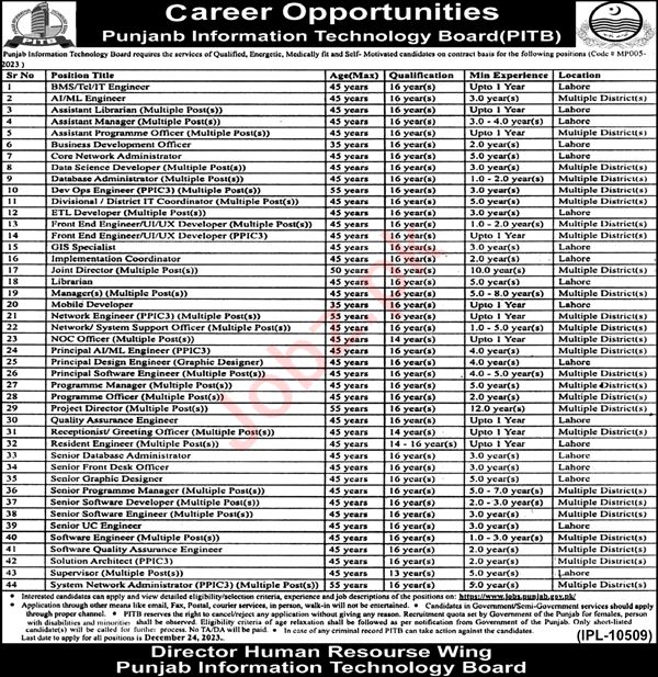 Apply at Punjab Information Technology Board PITB latest Government jobs in Management and departments before closing date which is around December 24, 2023 or as per closing date in newspaper ad. Read complete ad online to know how to apply on latest Punjab Information Technology Board PITB job opportunities.