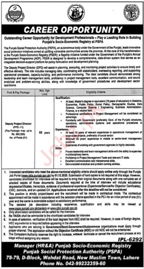 Punjab Social Protection Authority PSPA Lahore, lahore Punjab Pakistan invites applications from eligible candidates for the post of deputy project director as per advertisement of November 16, 2025 published in daily Jang Newspaper. Persons with Master etc. education can apply.