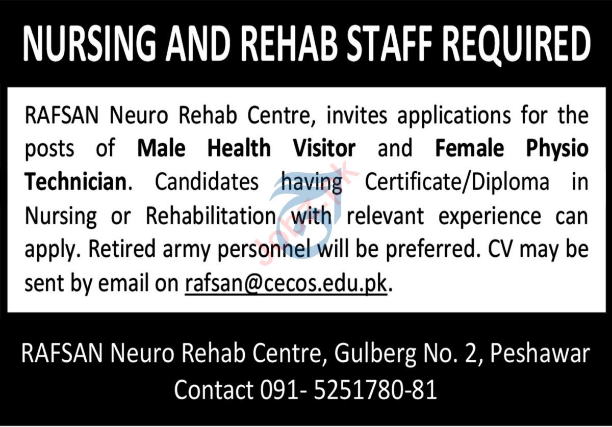 Vacant posts including male health visitor and female physio technician are announced in Rafsan Neuro Rehab Center Peshawar, peshawar Khyber Pakhtunkhwa KPK Pakistan as per 28 April 2024 advertisement in daily Aaj Newspaper. Candidates with Matric, Intermediate and Others etc. educational background will be preferred.