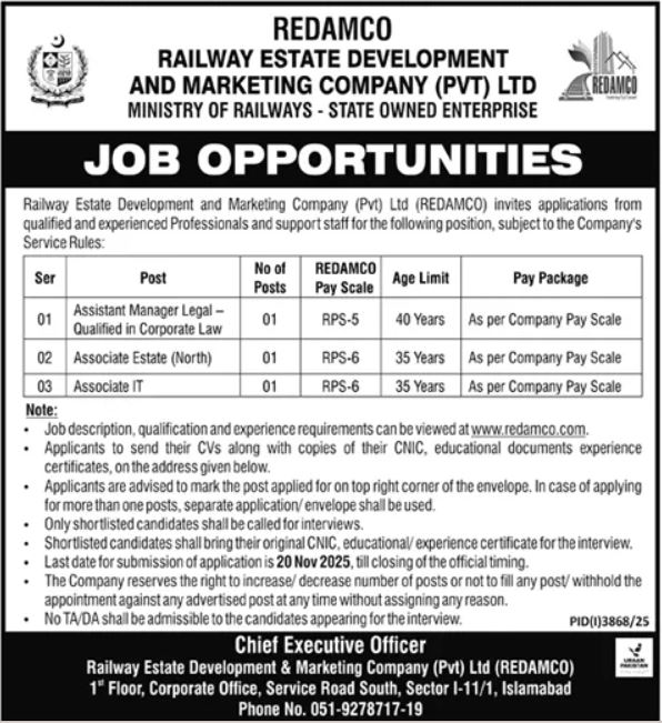 Railway Estate Development & Marketing Company Pvt Ltd REDMC invites applications for job positions advertised in daily Dunya dated 9 November 2025 for following vacancies in I-11/1 Islamabad, islamabad Islamabad Pakistan.