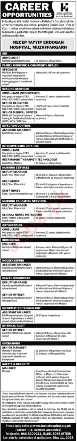 Indus Hospital & Health Network jobs advertisement dated about 27 April 2025 in daily The News Newspaper invites application for the vacant post of audiologist, deputy manager, head nurse, respiratory therapist, registrar, officer, consultant, clinical nurse instructor, technologist, medical officer, specialist, manager, staff nurse, assistant manager and engineer in Muzaffargarh, muzaffargarh Punjab Pakistan. Persons with MBBS, Intermediate, Master and Bachelor etc. education can apply.
