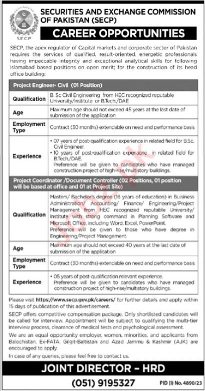 Securities and Exchange Commission of Pakistan Islamabad, islamabad Islamabad Pakistan invites applications from eligible candidates for the post of document controller, project coordinator and project engineer civil as per advertisement of February 19, 2024 published in daily Jang Newspaper. Candidates with Master, B.E and Bachelor etc. educational background will be preferred.
