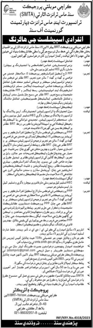 Transport & Mass Transit Department Karachi, karachi Sindh Pakistan invites applications from eligible candidates for the post of technical specialist, legal specialist and financial specialist as per advertisement of November 3, 2023 published in daily Kawish Newspaper. Preferred Education is Bachelor, Master and B.E etc.