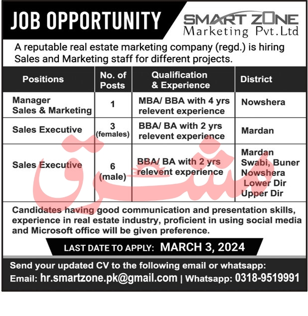 Real Estate Marketing Company invites applications for job positions advertised in daily Mashriq dated 28 February 2024 for following vacancies in Nowshera, lower dir, nowshera, upper dir, swabi, buner and mardan Khyber Pakhtunkhwa KPK Pakistan.