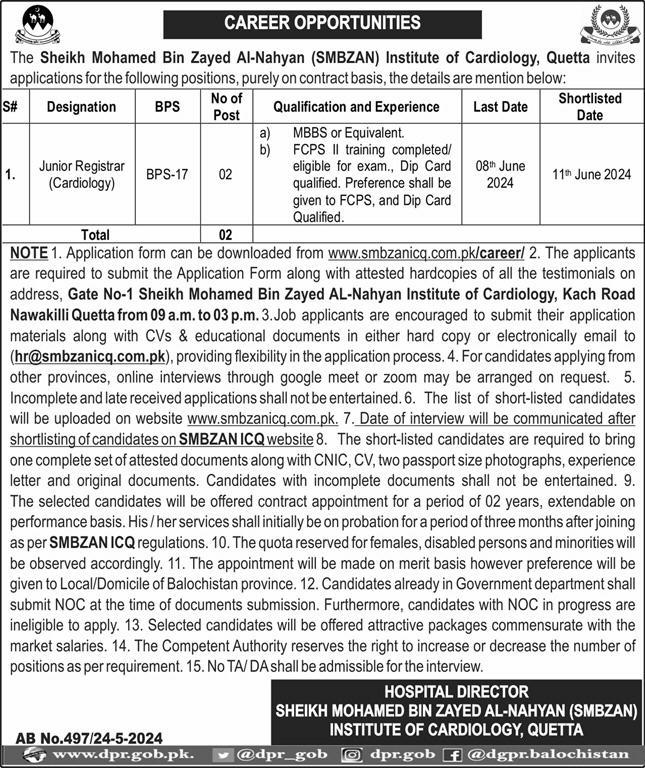 Vacant posts including registrar cardiology are announced in Sheikh Mohammad Bin Zayed Al Nahyan SMBZAN Institute of Cardiology Quetta, quetta Balochistan Pakistan as per 25 May 2024 advertisement in daily Express Newspaper. MBBS and Others etc. educational qualification will be preferred.