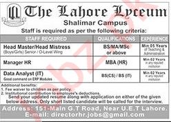 The Lahore Lyceum jobs advertisement dated about 8 September 2024 in daily The News Newspaper invites application for the vacant post of manager hr, head master, data analyst it and head mistress in Lahore, lahore Punjab Pakistan. Candidates with M.sc, MBA, BIT, MA and BCS etc. educational background will be preferred.