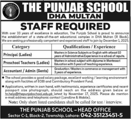 The Punjab School jobs advertisement dated about 09 November 2025 in daily Khabrain Newspaper invites application for the vacant post of admin, preschool teacher, principal and accountant in Multan, multan Punjab Pakistan. Educational qualifications required Master and Bachelor etc.