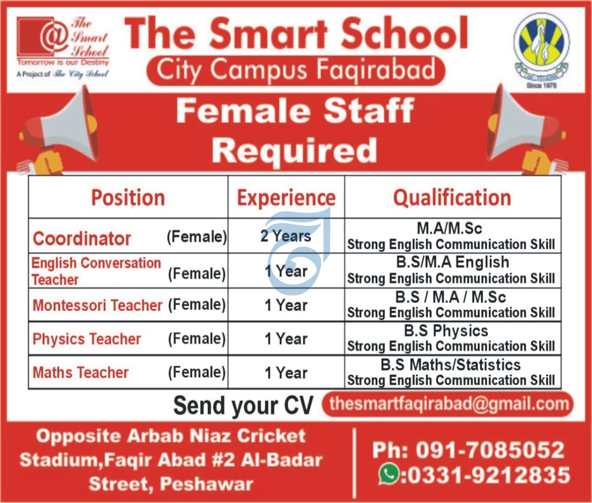 The Smart School jobs advertisement dated about 30 August 2025 in daily Aaj Newspaper invites application for the vacant post of female montessori teacher, female physics teacher, female elementary teacher drawing, female english conversation teacher, female maths teacher and female coordinator in Peshawar, peshawar Khyber Pakhtunkhwa KPK Pakistan. Educational qualifications required MA and M.sc etc.