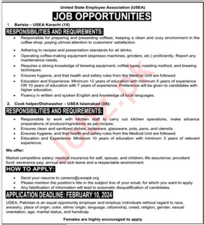 Vacant posts including barista, cook helper and dishwasher are announced in United State Employee Association USEA Karachi, islamabad and karachi Sindh Pakistan as per 28 January 2024 advertisement in daily Jang Newspaper. Candidates with Middle and Matric etc. educational background will be preferred.