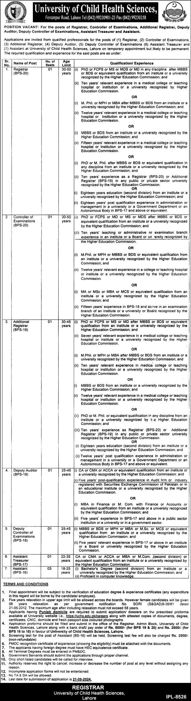 University of Child Health Sciences jobs advertisement dated about 7 September 2024 in daily Express Newspaper invites application for the vacant post of controller of examination, registrar, deputy controller of examination, additional registrar, assistant, deputy auditor and assistant treasurer in Lahore, lahore Punjab Pakistan. CA, Phd, BDS, MBBS, MBA, ACCA, Mphil, Bachelor and M.com etc. educational qualification will be preferred.