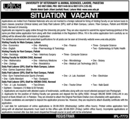 Vacancies in University of Veterinary and Animal Sciences UVAS Advertisement August 2024