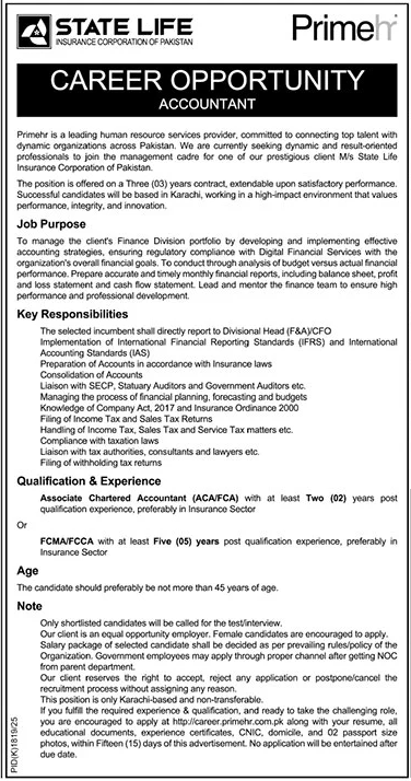 State Life Insurance Corporation of Pakistan Islamabad, islamabad Islamabad Pakistan invites applications from eligible candidates for the post of accountant as per advertisement of November 23, 2025 published in daily The News Newspaper. Candidates with ACCA etc. educational background will be preferred.
