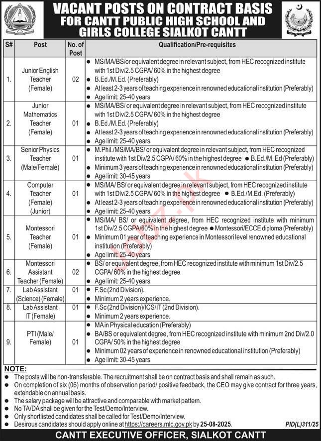 Latest Cantt Public High School and Girls College Education Posts Sialkot 2025