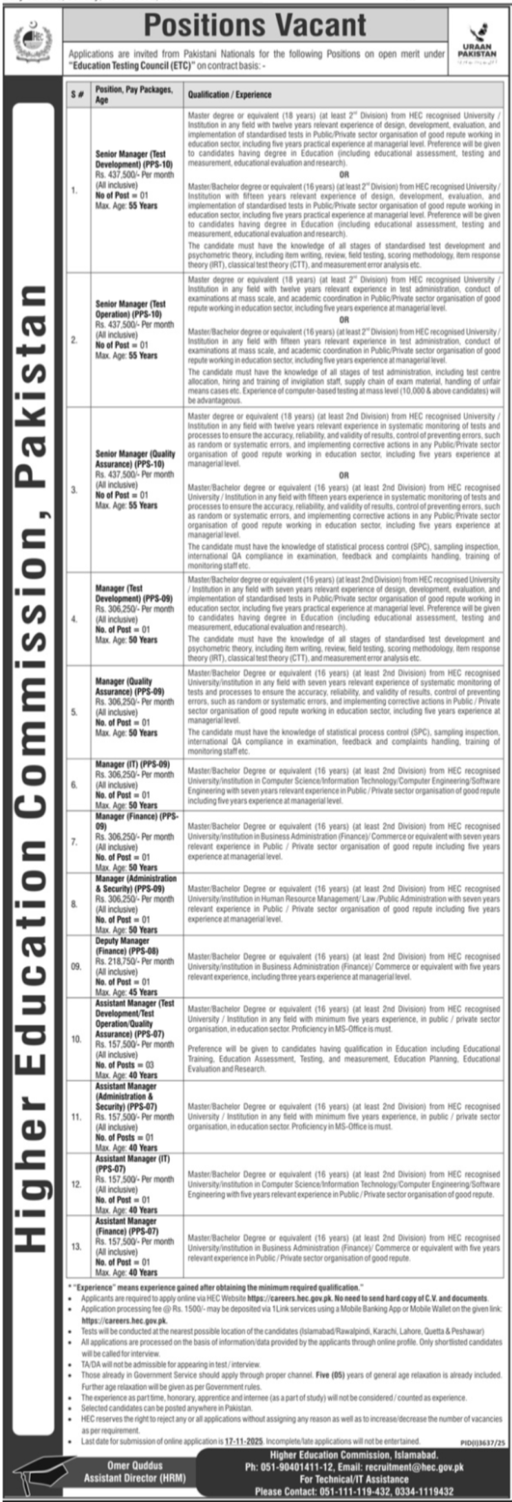 Higher Education Commission HEC Islamabad, islamabad Islamabad Pakistan invites applications from eligible candidates for the post of Manager Test Operation, Deputy Manager Finance, Assistant Manager It, Manager Test Development, Assistant Manager Test Development, Manager Finance, Manager It, Assistant Manager Finance, Manager Quality Assurance, Assistant Manager Administration Security and Manager Administration as per advertisement of November 2, 2025 published in daily Roznama 92 News Newspaper. Educational qualifications required Master and Bachelor etc.