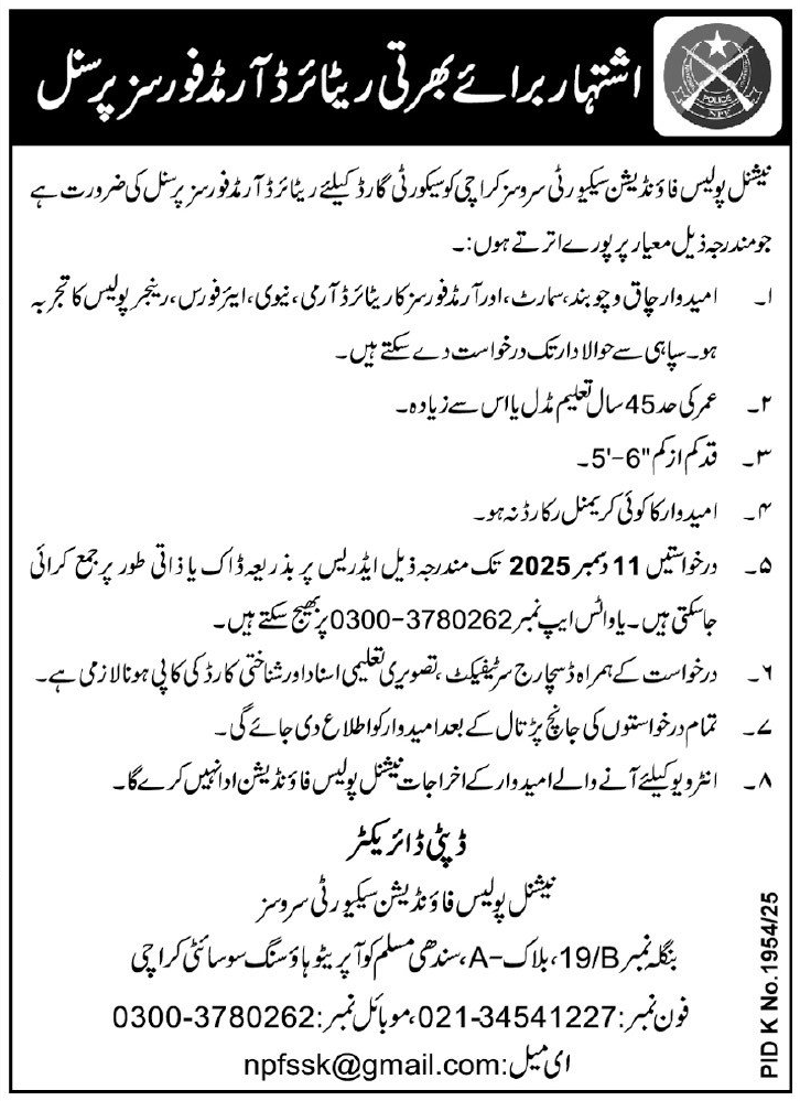 National Police Foundation Security Services jobs advertisement dated about 06 December 2025 in daily Express Tribune Newspaper invites application for the vacant post of security guard and retired armed forces personnel in Karachi, karachi Sindh Pakistan. Persons with Middle etc. education can apply.