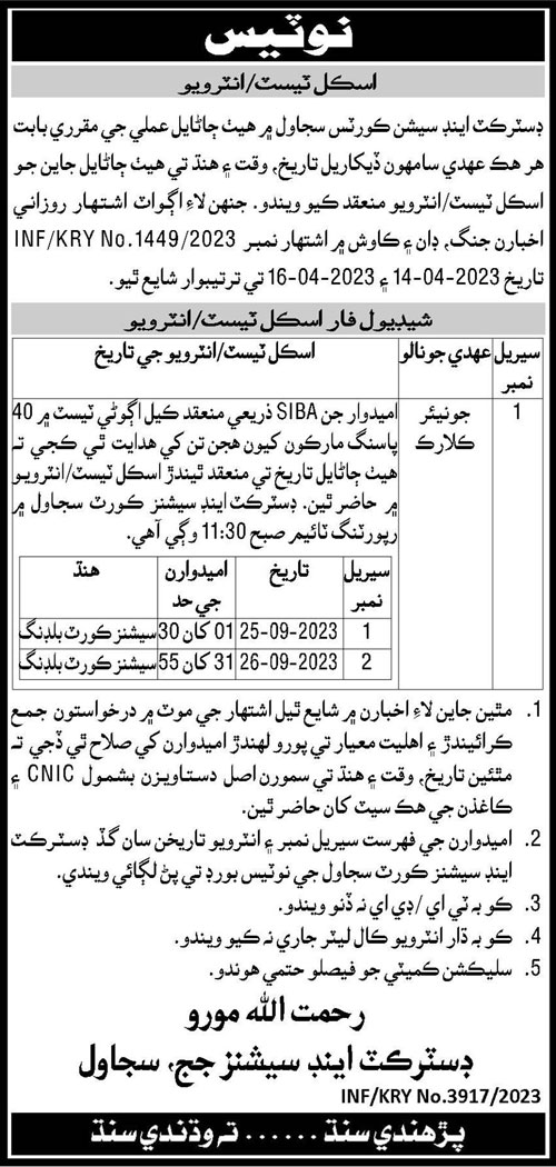 Latest District & Session Court Admin Clerical Posts Sujawal 2025