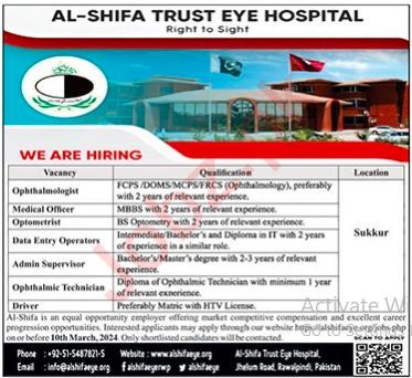 Al Shifa Trust Eye Hospital Rawalpindi, rawalpindi Punjab Pakistan invites applications from eligible candidates for the post of optometrist, admin supervisor, ophthalmologist, driver, ophthalmic technician, medical officer and data entry operator as per advertisement of February 26, 2024 published in daily The News Newspaper. Persons with Intermediate, Bachelor, Matric, Others and MBBS etc. education can apply.