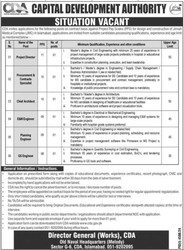 Vacant posts including qs engineer, project director, em engineer, chief architect, planning engineer and procurement contracts specialist are announced in Capital Development Authority CDA Islamabad, islamabad Islamabad Pakistan as per 8 January 2025 advertisement in daily Jang Newspaper. Preferred Education is Bachelor and Master etc.