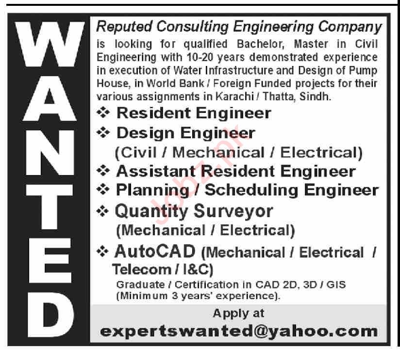 Consulting Engineering Company jobs advertisement dated about 15 October 2023 in daily Dawn Newspaper invites application for the vacant post of design engineer civil, design engineer mechanical, resident engineer, quantity surveyor, planning engineer, design engineer electrical, scheduling engineer, autocad and assistant resident engineer in Karachi, karachi Sindh Pakistan. Educational qualifications required B.E, Master and Bachelor etc.