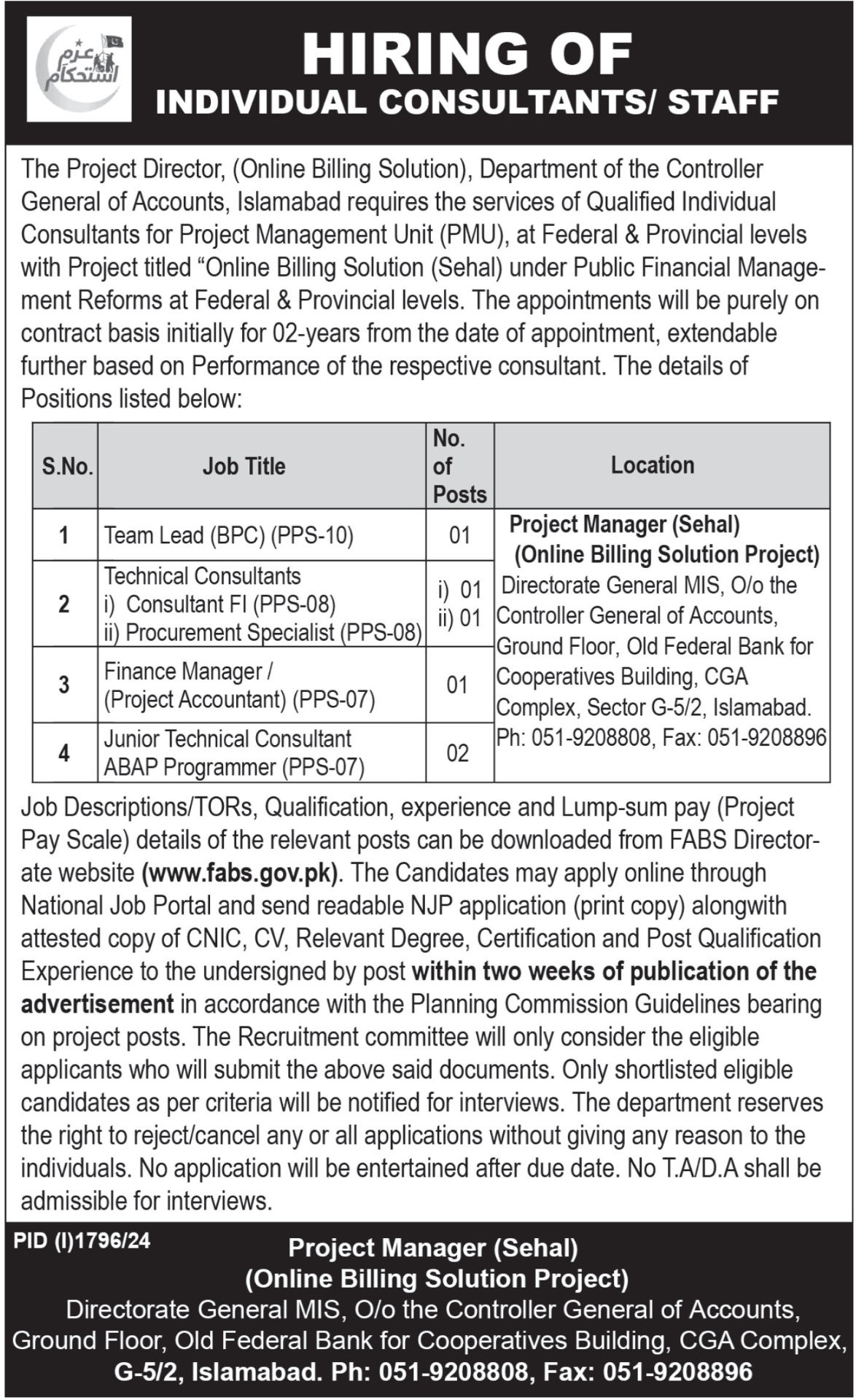 Controller General of Accounts CGA Islamabad, islamabad Islamabad Pakistan invites applications from eligible candidates for the post of finance amanager, project accountant, procurement specialist, team lead, consultant fl, technical consultant and abap programmer as per advertisement of September 11, 2024 published in daily Express Tribune Newspaper. Candidates with Master and Bachelor etc. educational background will be preferred.