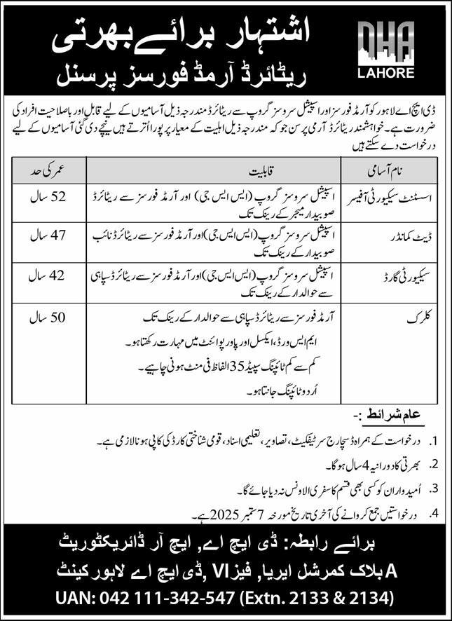 Vacant posts including assistant security officer, date commander, security guard and clerk are announced in Defence Housing Authority DHA DHA Phase 6 Lahore, lahore Punjab Pakistan as per 24 August 2025 advertisement in daily Express Newspaper. Bachelor, Intermediate and Middle etc. educational qualification will be preferred.