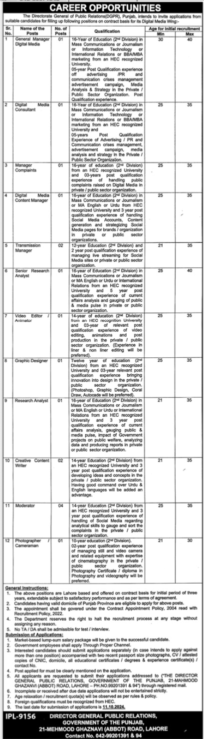 Vacant posts including research analyst, digital media content manager, photographer, animator, graphic designer, creative content writer, video editor, moderator, manager complaints, cameraman, transmission manager, general manager digital media and digital media consultant are announced in Directorate General Public Relations Lahore, lahore Punjab Pakistan as per 24 September 2024 advertisement in daily Jang Newspaper. Preferred Education is Intermediate, Matric, Master and Bachelor etc.