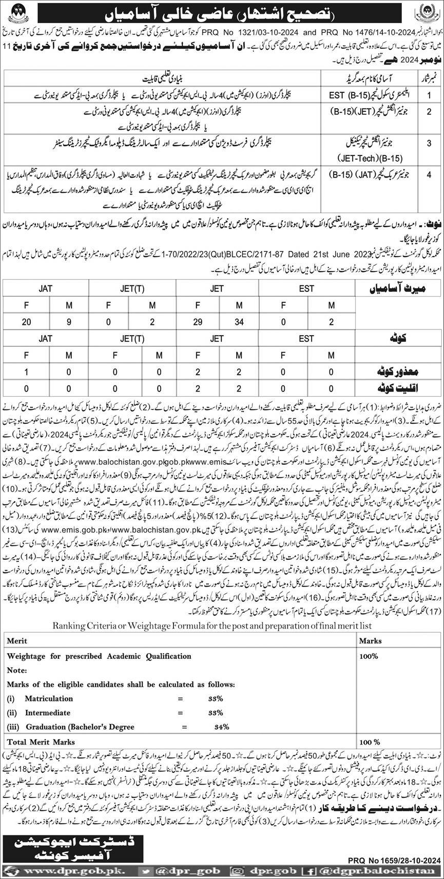 Education Department invites applications for job positions advertised in daily Express dated 29 October 2024 for following vacancies in Quetta, quetta Balochistan Pakistan.