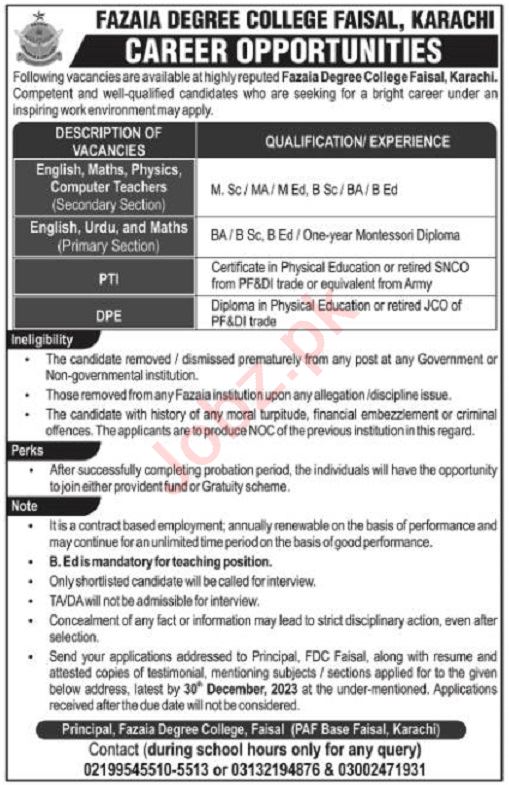 Vacant posts including pti, english teacher, maths teacher, computer teacher, urdu teacher, physics teacher and dpe are announced in Fazaia Degree College Karachi, karachi Sindh Pakistan as per 24 December 2023 advertisement in daily Nation Newspaper. Educational qualifications required BA, M.ed, M.sc, MA, Others and B.ed etc.