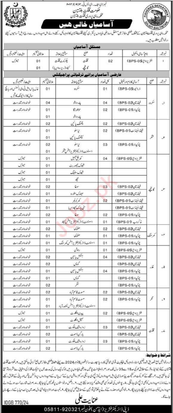 Fisheries Department jobs advertisement dated about 13 October 2024 in daily K2 Newspaper invites application for the vacant post of fisheries watcher, field man, chowkidar, khakrob, driver and field attendant in Gilgit, gilgit Gilgit Baltistan Pakistan. Persons with Matric and Primary etc. education can apply.