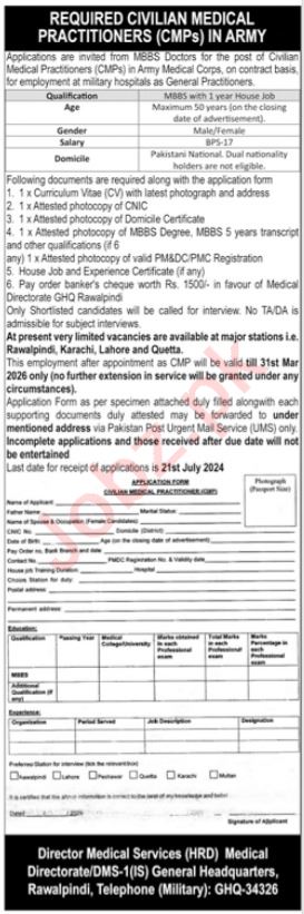 General Head Quarter GHQ jobs advertisement dated about 7 July 2024 in daily Jang Newspaper invites application for the vacant post of civilian medical practitioner in Rawalpindi, rawalpindi Punjab Pakistan. Candidates with MBBS etc. educational background will be preferred.