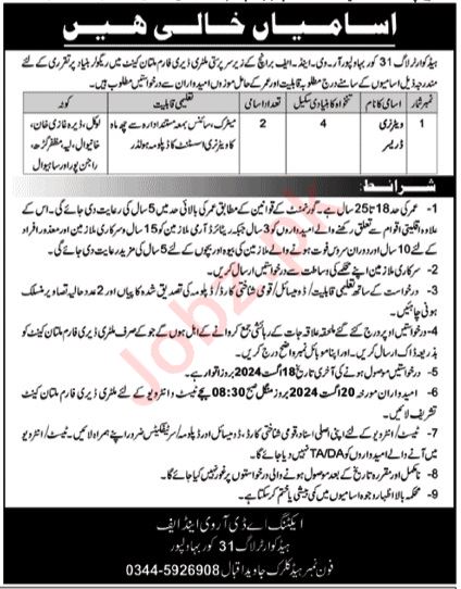 Job Vacancies at Headquarter Log 31 Core Bahawalpur