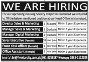 Vacant posts including female sales executive, manager digital marketing, director sales marketing, manager sales marketing, female office assistant and female front desk officer are announced in Housing Project Islamabad, islamabad Islamabad Pakistan as per 3 April 2022 advertisement in daily Jang Newspaper. Candidates with Intermediate and Bachelor etc. educational background will be preferred.