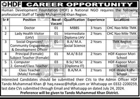 Human Development Foundation invites applications for job positions advertised in daily Kawish dated 22 July 2024 for following vacancies in Tando Muhammad Khan, tando muhammad khan Sindh Pakistan.