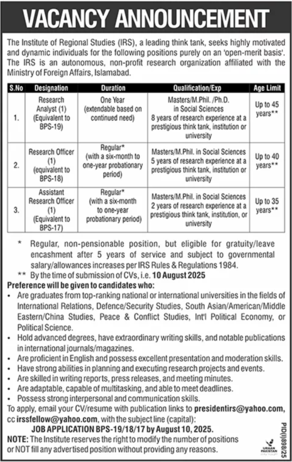 Institute of Regional Studies IRS invites applications for job positions advertised in daily Dunya dated 3 August 2025 for following vacancies in Islamabad, islamabad Islamabad Pakistan.