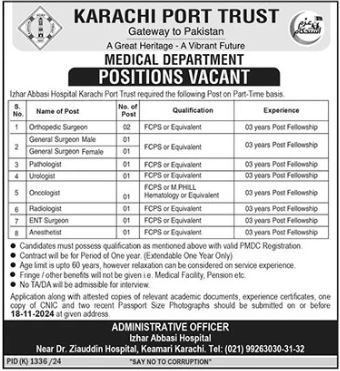 Latest Government jobs in Karachi Port Trust in Medical and others can be applied till 18 November 2024 or as per closing date in newspaper ad. Read complete ad online to know how to apply on latest Karachi Port Trust job opportunities.