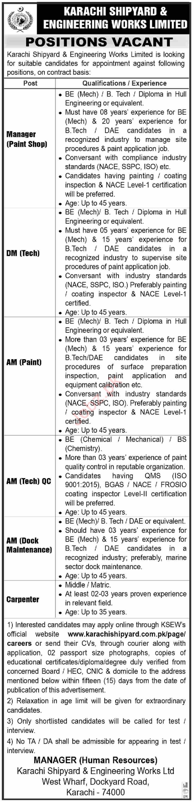 Karachi Shipyard and Engineering Works Limited jobs advertisement dated about 8 October 2023 in daily Dawn Newspaper invites application for the vacant post of carpenter, assistant manager am dock maintenance, deputy manager dm technical, manager paint shop, assistant manager technical qc and assistant manager am paint in Karachi, karachi Sindh Pakistan. Persons with DAE, Matric, Bachelor, Middle and B.E etc. education can apply.