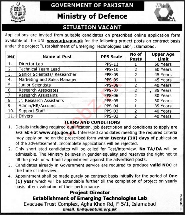 Ministry of Defence invites applications for job positions advertised in daily Nation dated 24 November 2024 for following vacancies in Islamabad, islamabad Islamabad Pakistan.
