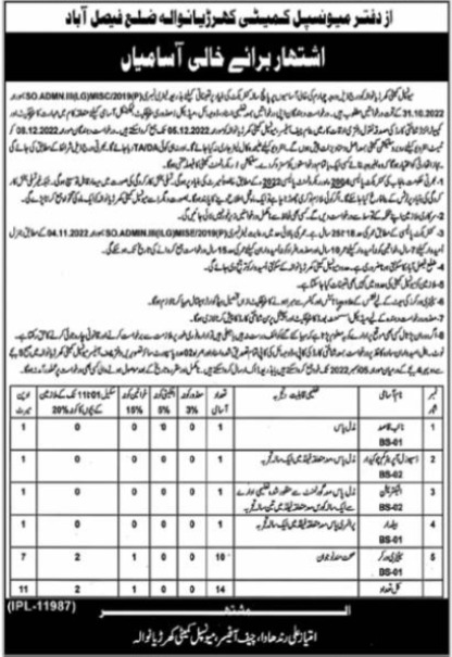 Vacant posts including electrician, beldar, disposal operator cum chowkidar, naib qasid and sanitary worker are announced in Municipal Committee Faisalabad, faisalabad Punjab Pakistan as per 18 November 2022 advertisement in daily Nawaiwaqt Newspaper. Persons with Primary and Middle etc. education can apply.