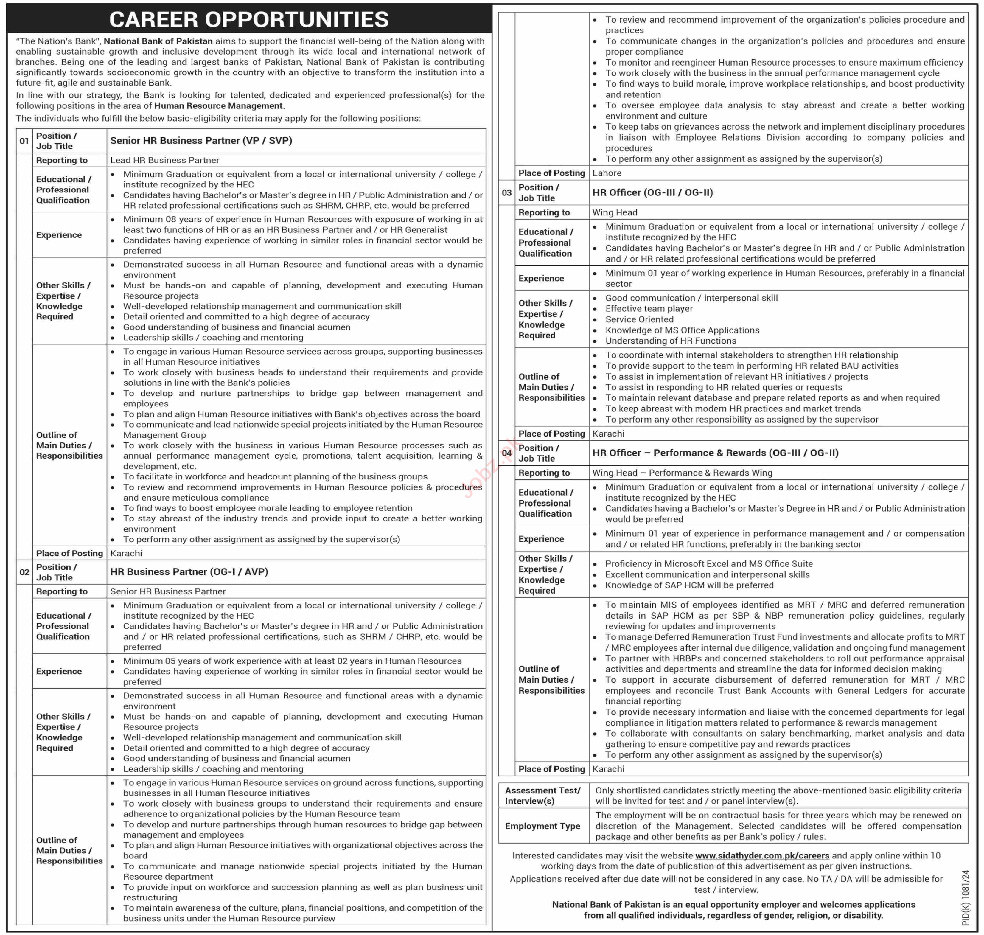 National Bank of Pakistan NBP Karachi, karachi and lahore Sindh Pakistan invites applications from eligible candidates for the post of hr officer and hr business partner as per advertisement of October 13, 2024 published in daily Dawn Newspaper. Preferred Education is Master and Bachelor etc.