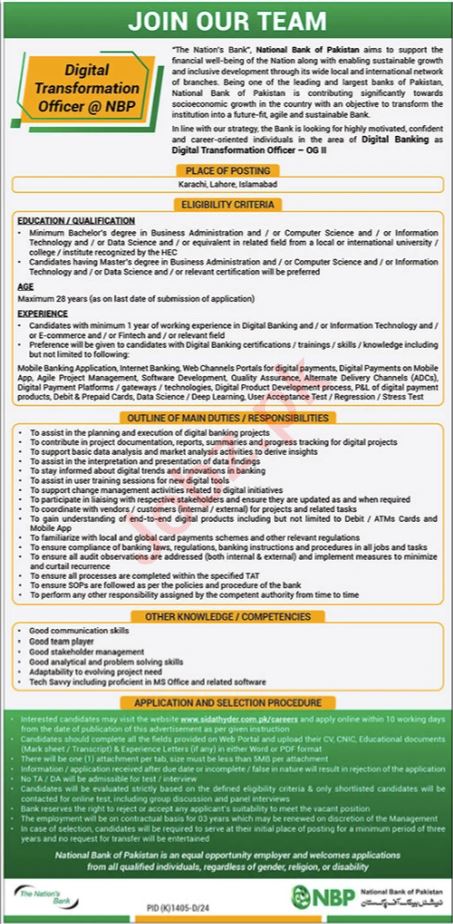 Vacant posts including digital transformation officer are announced in National Bank of Pakistan NBP Karachi, karachi, lahore and islamabad Sindh Pakistan as per 3 November 2024 advertisement in daily The News Newspaper. Educational qualifications required Master and Bachelor etc.
