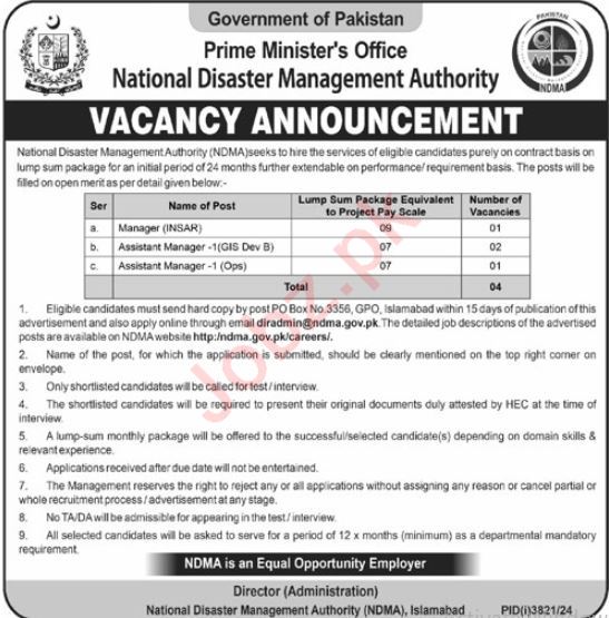 Vacancies in National Disaster Management Authority Advertisement December 2024