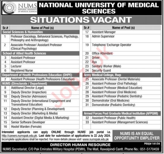 Apply at National University of Medical Sciences NUMS latest Government jobs in Management and departments before closing date which is around July 22, 2024 or as per closing date in newspaper ad. Read complete ad online to know how to apply on latest National University of Medical Sciences NUMS job opportunities.
