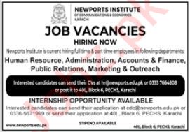 Newports Institute of Communications & Economics jobs advertisement dated about 18 February 2024 in daily Jang Newspaper invites application for the vacant post of administration staff, accounts finance staff, human resource staff, marketing outreach staff and public relations staff in Karachi, karachi Sindh Pakistan. Master, Bachelor and Others etc. educational qualification will be preferred.
