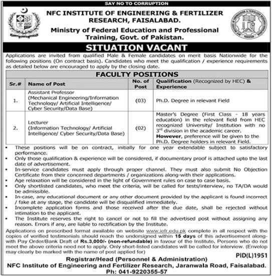 Vacancies in NFC Institute of Engineering and Fertilizer Research Advertisement December 2023