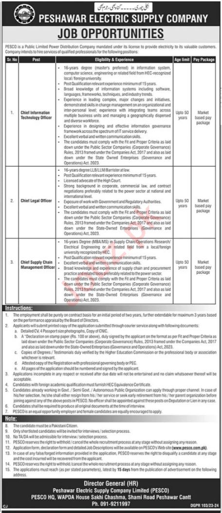 Vacant posts including chief legal officer, chief supply chain management officer and chief information technology officer are announced in Peshawar Electric Supply Company PESCO Peshawar, peshawar Khyber Pakhtunkhwa KPK Pakistan as per 28 April 2024 advertisement in daily The News Newspaper. Candidates with MBA, Master, LLb, Bachelor, LLM and MS etc. educational background will be preferred.