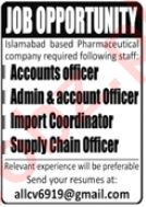 Pharmaceutical Company Islamabad, islamabad Islamabad Pakistan invites applications from eligible candidates for the post of import coordinator, supply chain officer, accounts officer and admin account officer as per advertisement of May 19, 2024 published in daily Jang Newspaper. Preferred Education is Bachelor and Master etc.